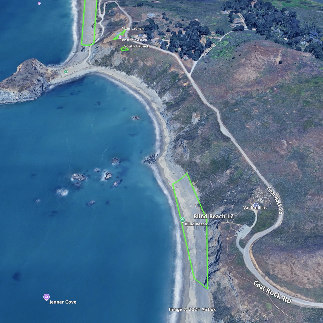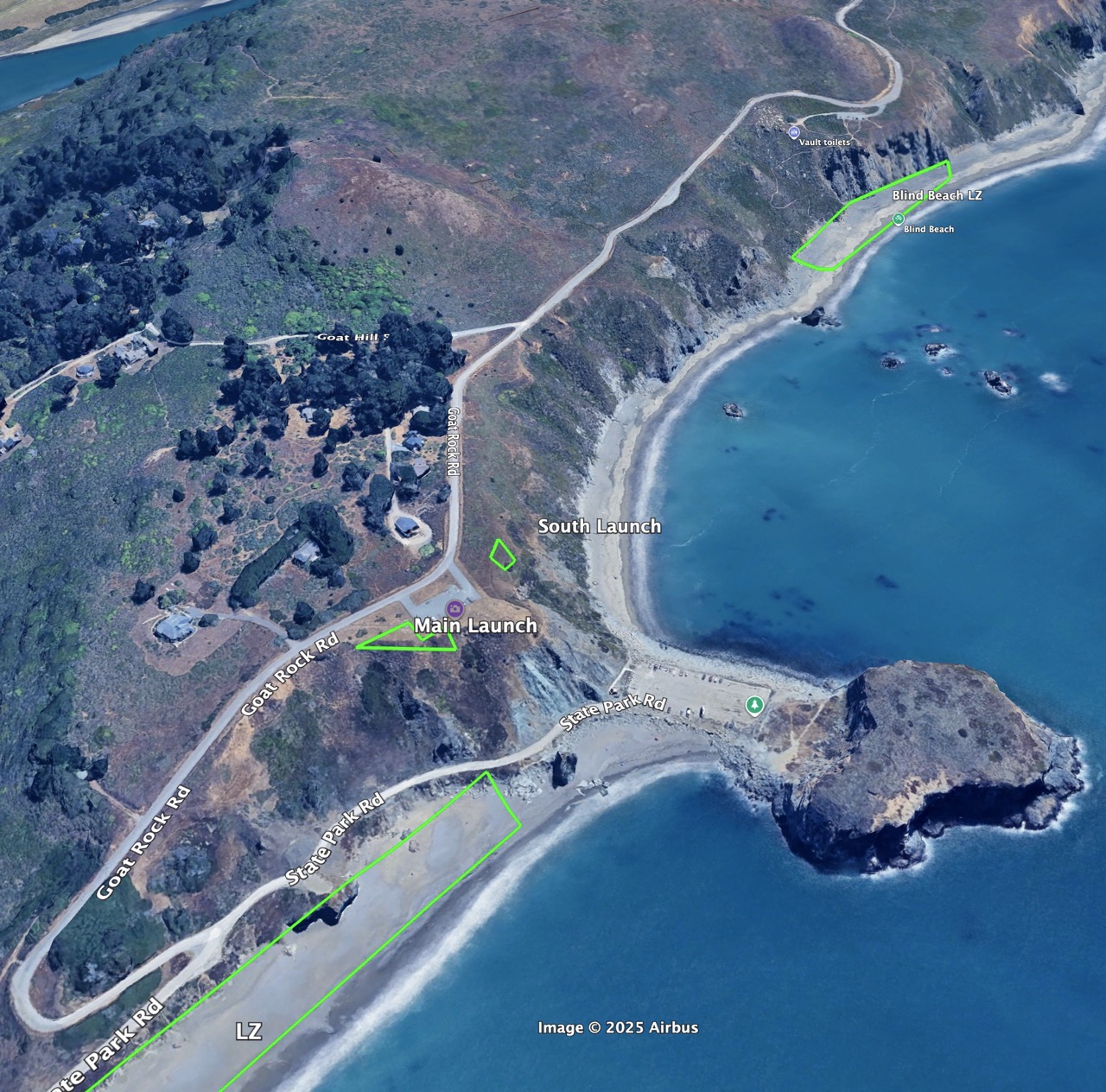 • The Primary LZ is on the beach just below launch or to the south below the Blind Beach parking lot